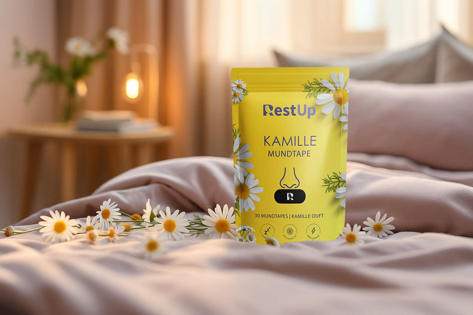 "Viele Menschen suchen die Lösung für Schlafprobleme in Pillen oder Kissen, aber vergessen ihre Atmung. RestUp Mundtape hält Ihren Mund sanft geschlossen und stellt Ihre Atmung auf die Nase um, während es die ganze Nacht einen beruhigenden Kamilleduft verbreitet. Es hilft dem Nervensystem zu entspannen, wodurch der Körper zur Ruhe kommt und der Schlaf sich vertieft — ohne Nebenwirkungen. Eine natürliche Lösung für alle, die wirklich durchschlafen wollen."